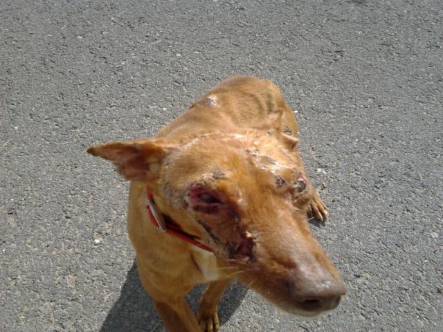 extremadamente delgada y desnutrida, y muy enferma con multitud de heridas