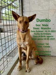 Dumbo es otra víctima del abandono durante la temporada de caza. Es un perro noble y sociable con otros perros.